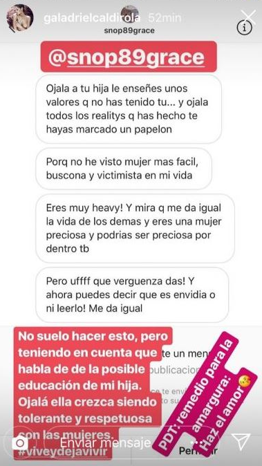 Ante estas palabras, Caldirola mostró la cuenta y los mensajes que le enviaron. «No suelo hacer esto, pero teniendo en cuenta que habla de la posible educación de mi hija. Ojalá ella crezca siendo tolerante y respetuosa con las mujeres», escribió la española.