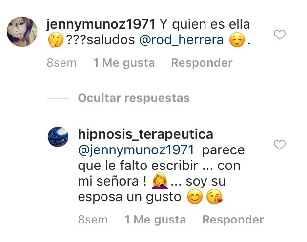 Publicación que también comentó la esposa de Rodrigo Herrera, quien aclaró de manera irónica que es su pareja, ya que él se le había olvidado especificarle. «Parece que le faltó escribir… con mi señora! soy su esposa un gusto», escribió Denisse en la red social.