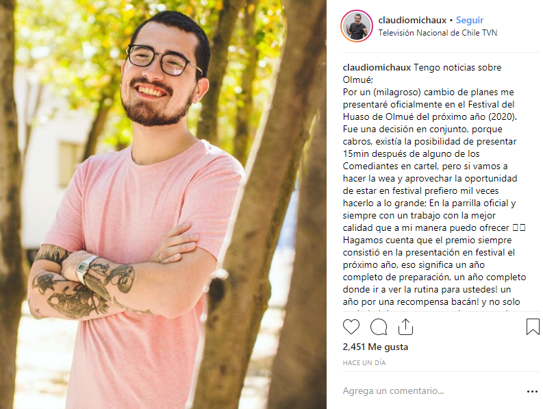 “Por un (milagroso) cambio de planes me presentaré oficialmente en el Festival del Huaso de Olmué del próximo año (2020). Fue una decisión en conjunto, porque cabros, existía la posibilidad de presentar 15 minutos después de alguno de los comediantes en cartel, pero si vamos a hacer la wea y aprovechar la oportunidad de estar en festival prefiero mil veces hacerlo a lo grande; en la parrilla oficial y siempre con un trabajo con la mejor calidad que a mi manera puedo ofrecer (sic)”, escribió Claudio en sus redes sociales. A
