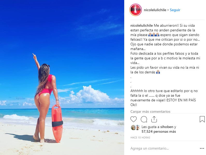«Foto dedicada a los perfiles falsos y a toda la gente que a, b o c motivo le molesta mi vida… Les pido un favor, vivan su vida no la mía ni la de los demás… Ahhh, lo otro tuve que editarlo, por que no falta la o el… que dice que ya se fue nuevamente de viaje!! ESTOY EN MI PAÍS Ok!!», agregó Luli.
