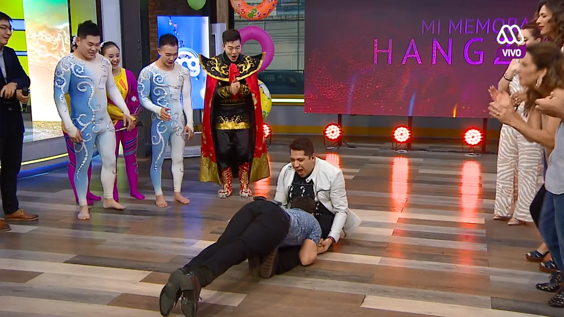 Un divertido momento se vivió el pasado jueves en el matinal «Mucho Gusto» de Mega durante la visita de un grupo de acróbatas chinos.