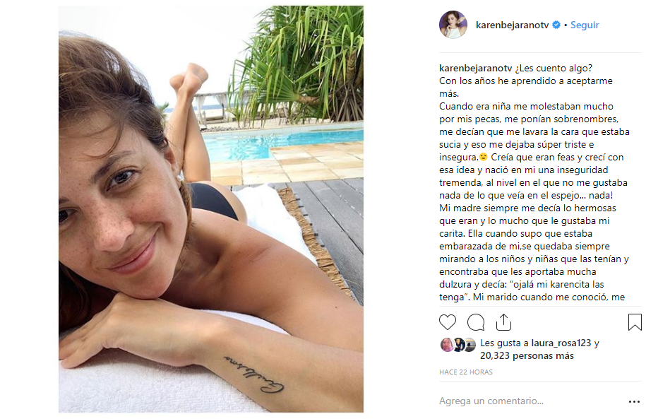 Sin embargo, una de sus publicaciones llamó la atención debido a que la panelista se mostró al natural para contar que en el colegio la molestaban por sus pecas.