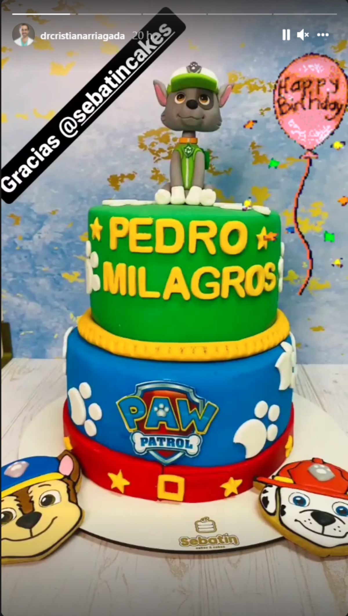Cristián Arriagada mostró los detalles de la decoración de la fiesta de Pedrito Milagros, que incluía banderines de colores, globos. Además una mesa de dulces y una torta personalizada con los personajes de la serie infantil «Paw Patrol».