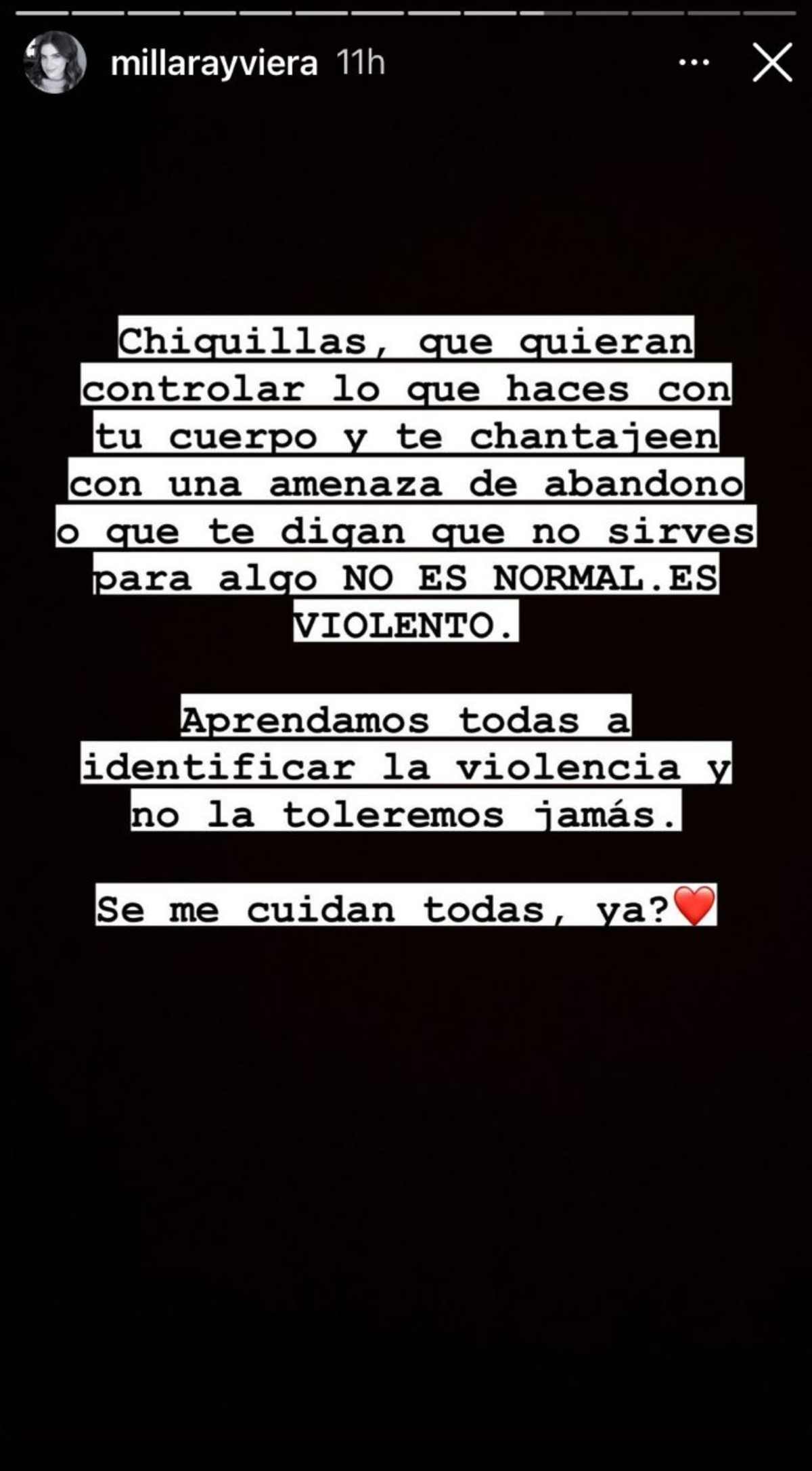 «No puedo negar que siento una pena negra cuando leo este tipo de desahogos», comenzó escribiendo Millaray Viera. «Tenemos que aprender a identificar todo tipo de violencia. Debemos buscar información, dejar de normalizar lo anormal», añadió preocupada.